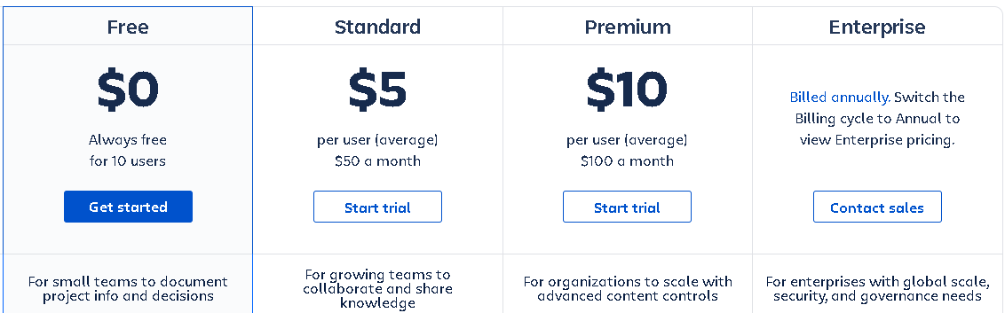 Confluence Cloud 무료 평가판이 10인 이하의 소규모 Team에게 무료로 제공된다.