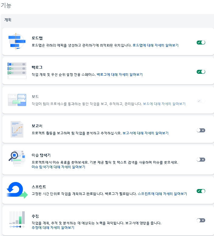 여기서 백로그/스프린트 등의 기능을 추가로 On 가능하다