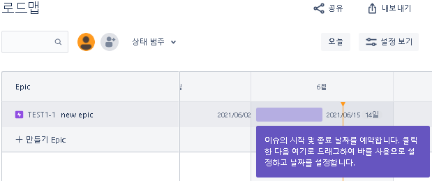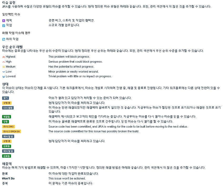 | 태스크 (작업) | 에픽/스토리의 하위 작업 각 태스크에도 태스크의 하위 태스크를 생성가능하다. 예) 유사 기능 조사, 테스트 시나리오 작성 등 |
