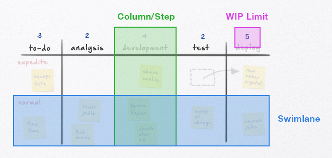 칸반 보드에 칸반 카드를 붙였다 떼면서 진행하며, 작업 내용과 진행 상태 추적에 도움을 준다.