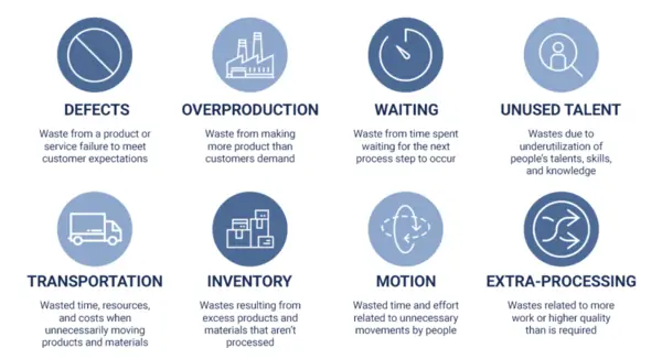 → Wait, Defect, Transport, Movement, Excess Inventory, Excess production, Unnecessary processing, Unused talent