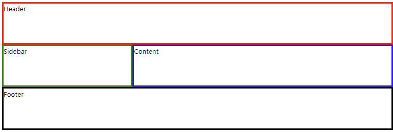 .container { display: grid; grid-template-columns: repeat(9, 1fr); grid-auto-rows: minmax(100px, auto); grid-template-areas: "hd hd hd hd hd hd hd hd hd" "sd sd sd main main main main main main" "ft ft ft ft ft ft ft ft ft"; } .header { border: 4px solid red; grid-area: hd; } .footer { border: 4px solid ; grid-area: ft; } .content { border: 4px solid blue; grid-area: main; } .sidebar { border: 4px solid green; grid-area: sd; } /* html */ <body> <div class="container"> <div class="header">Header</div> <div class="sidebar">Sidebar</div> <div class="content">Content</div> <div class="footer">Footer</div> </div> </body>