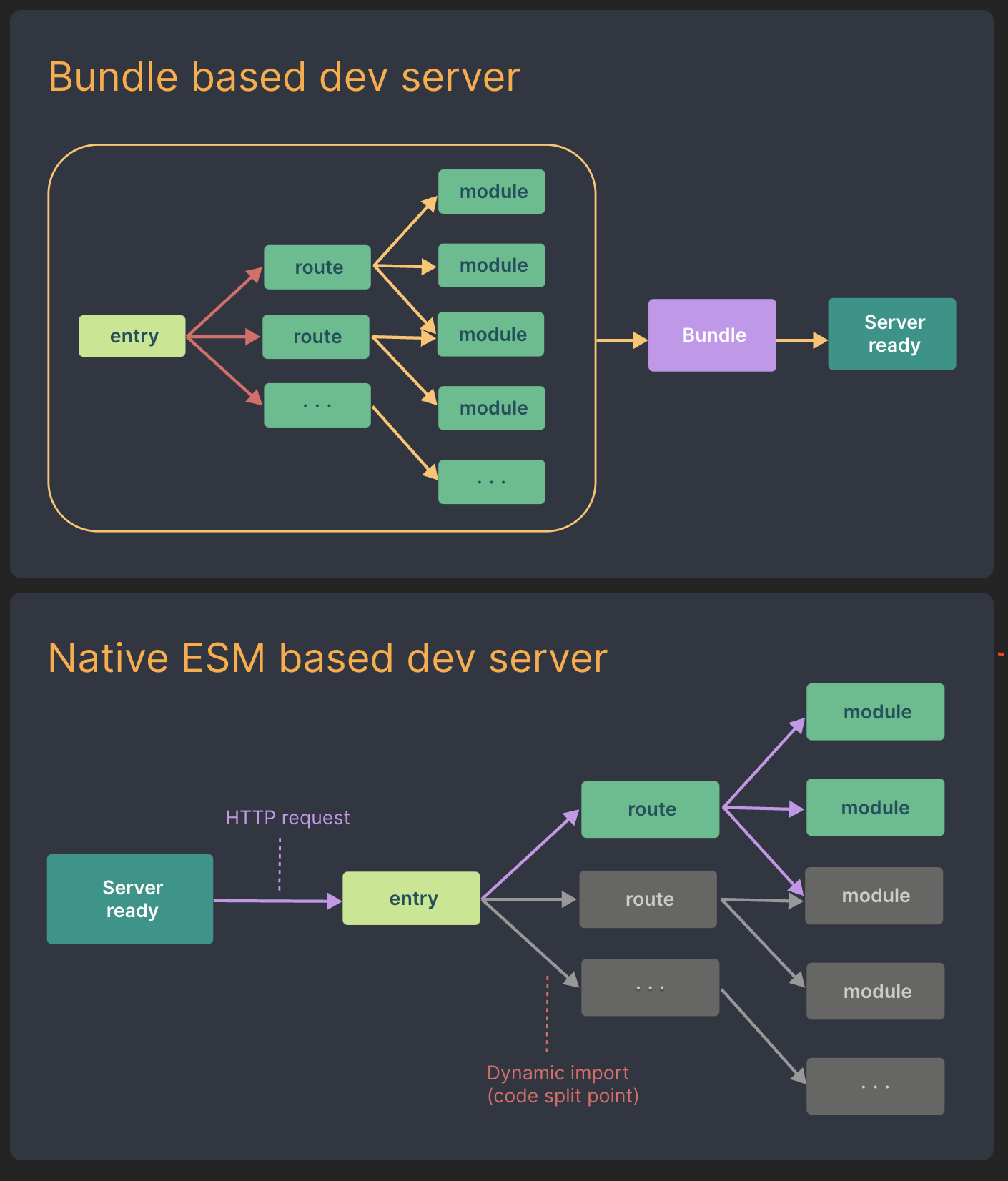 - 전체 모듈을 번들로 묶어서 전달하는 것이 아니라 요청한 페이지만 번들로 묶어서 전달합니다. 이는 Native ESM과 비슷하지만, Native ESM을 사용하지 않는 이유는 빠르지만, 대규모 APP 에서 확장 문제를 일으킬 수 있기 때문입니다.