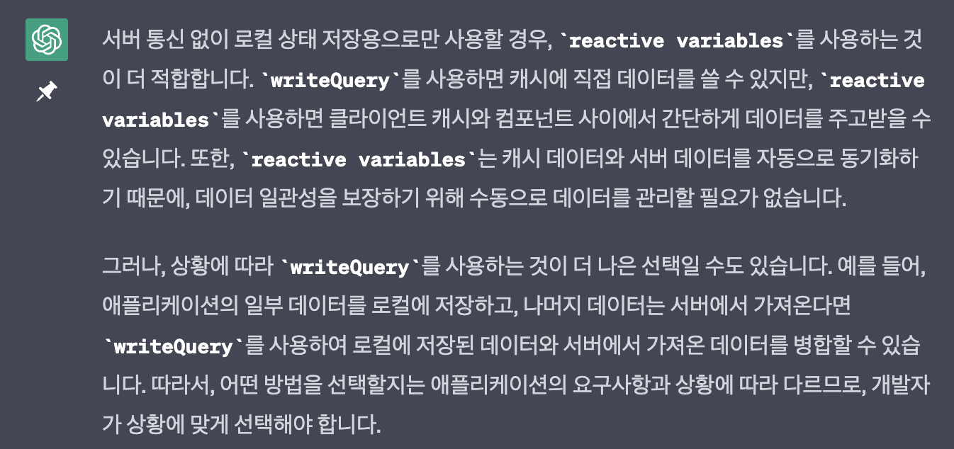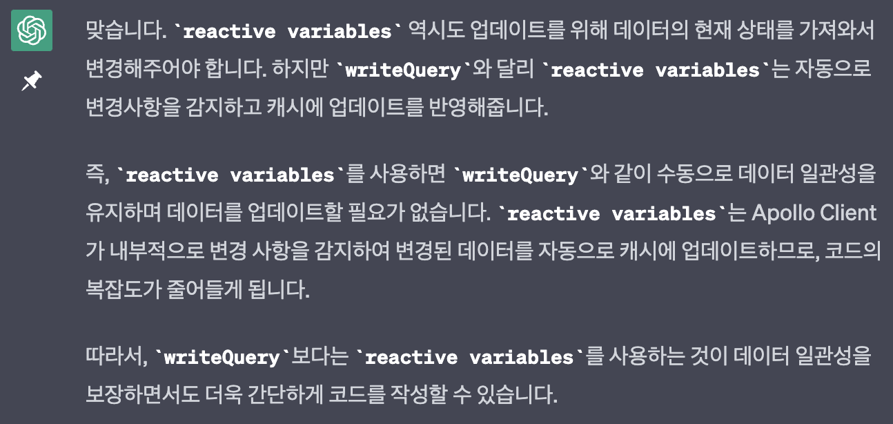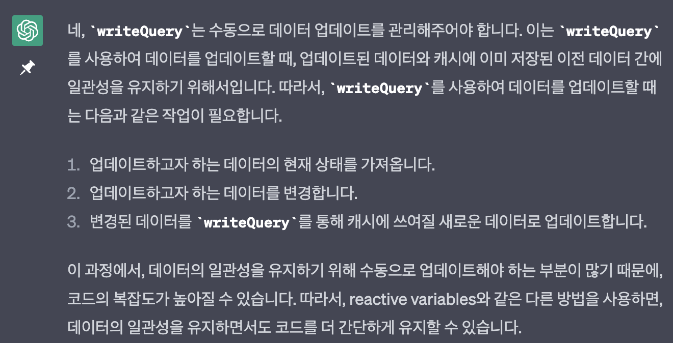 writeQuery 가 데이터를 수동으로 관리한다는게 이해가 안되어서 더 물어보았습니다. 🤔