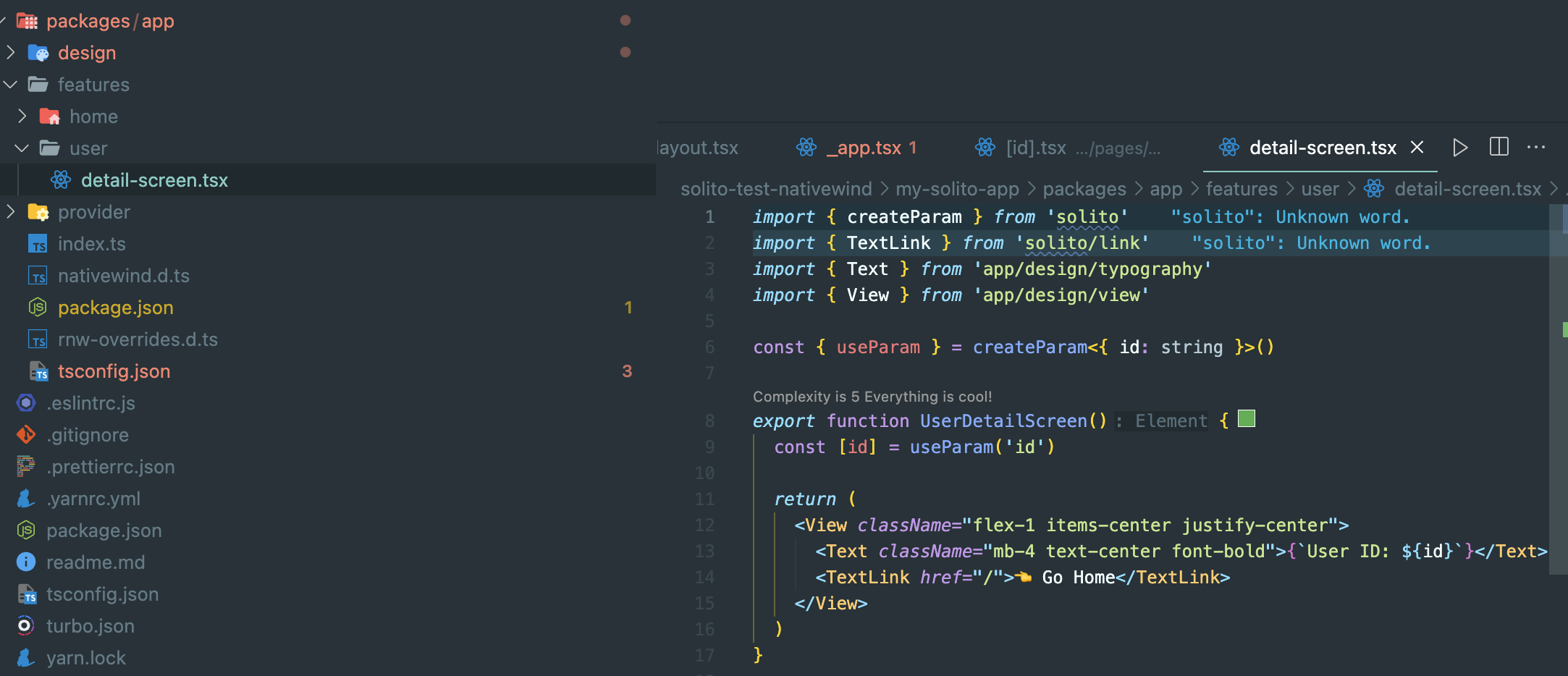 예제 프로젝트를 뜯어서 보면, 공통 UI 화면 컴포넌트 Solito API 를 사용하여 페이지 라우팅을 처리하고 있습니다. 라우팅 처리와 스타일을 플랫폼에 공통적으로 사용할 수 있게 되면서 이러한 모노레포 구조가 가능하게 되었습니다.