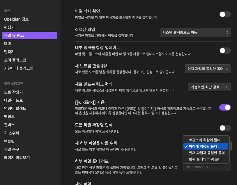 | 옵시디언(obsidian) - 새 노트의 기본 저장 위치 변경하기 (0) | 2024.11.09 |