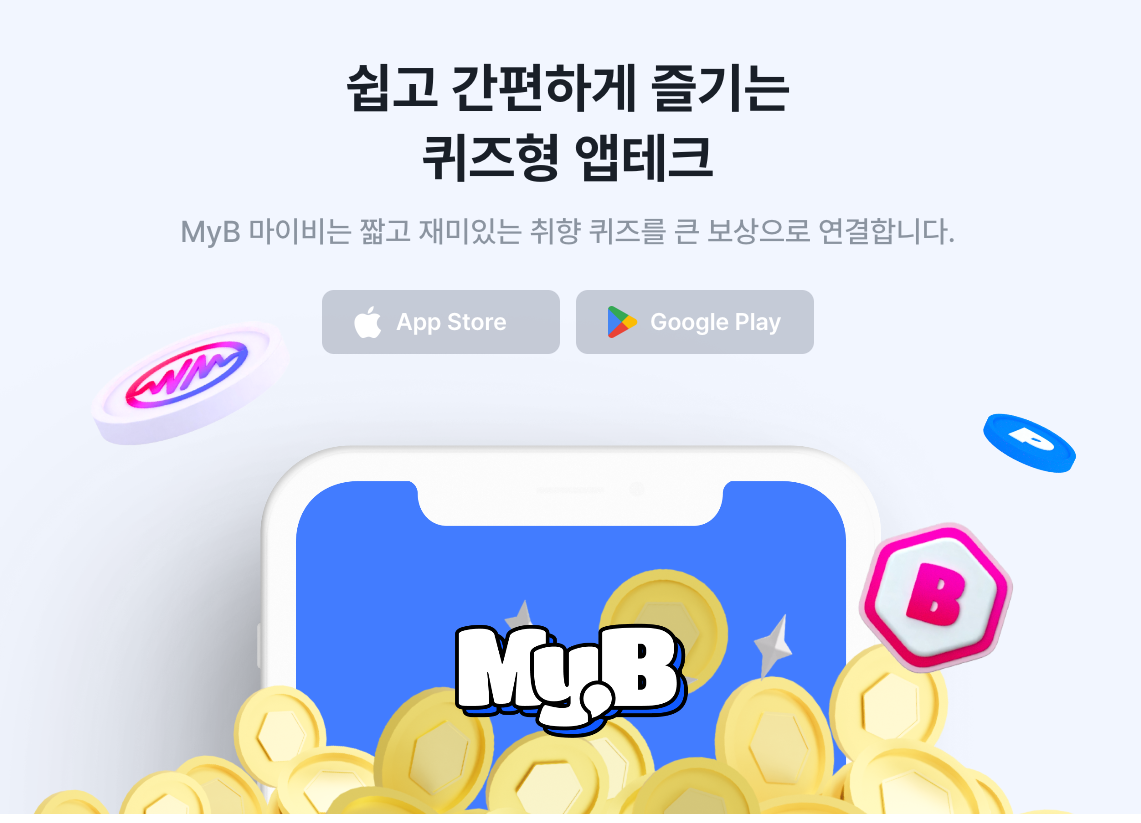 MyB 마이비는 짧고 재미있는 퀴즈와 설문을 큰 보상으로 연결하는 퀴즈형 앱테크 입니다.