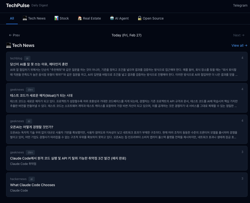 바쁘게 살면서 기술 트랜드, 세상 돌아가는 것(주식, 부동산) 등을 따라가기 쉽지 않아서 이런 서비스를 하나 프로젝트 삼아 만들었습니다.