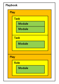| 구성 | 하나 이상의 Play 들로 이루어져 있다. - plays : 서버(그룹)에 대해 정의된 role 들을 실행 시키는 것. 여러 개의 tasks로 이루어짐. - tasks : ansible의 작업 단위 (ad-hoc 명령을 사용하여 단일 작업을 한 번 실행할 수 있다.) - Modules ![]() |