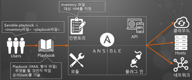| 실행 방법 | ansible 명령을 사용해서 단일 모듈을 호출 가능 ansible-playbooks 명령을 통해서 여러 모듈 호출 가능 |